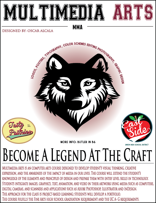 Multimedia Art is a computer arts course designed to develop student’s visual thinking, creative expression, and the awareness of the impact of media in our lives. The course will extend the student’s knowledge of the elements and principles of design and prepare them with entry level skills in technology.