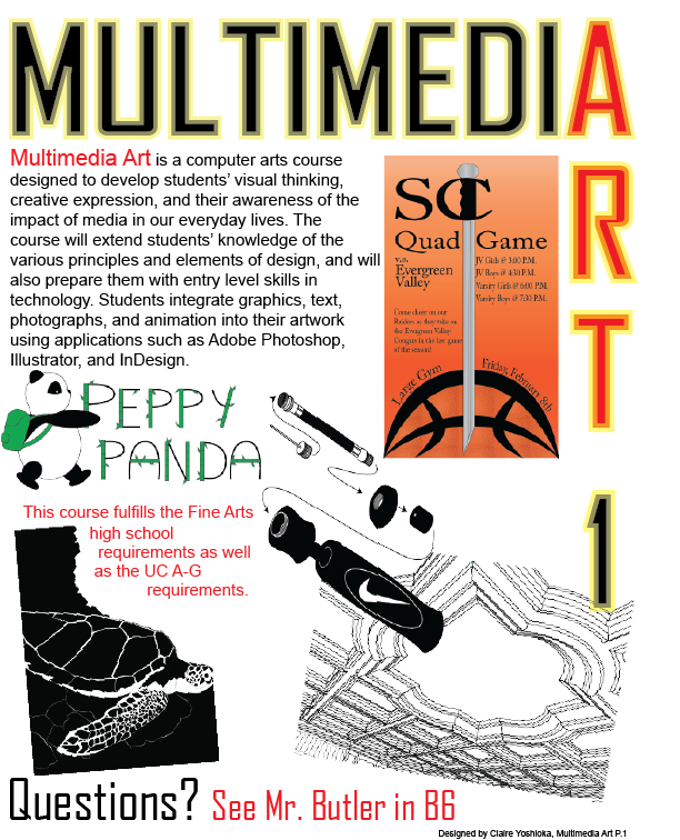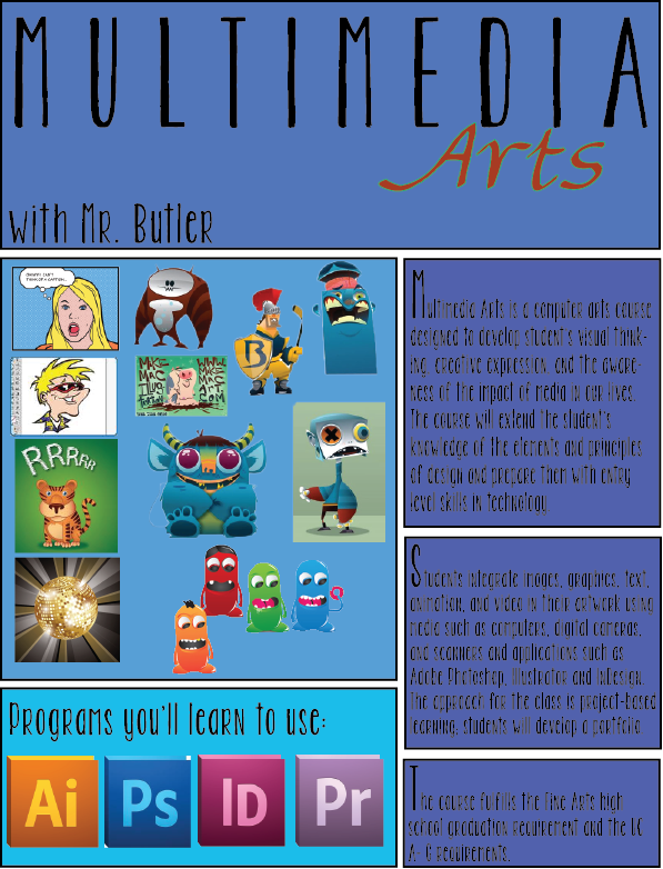 Multimedia Art is a computer arts course designed to develop student’s visual thinking, creative expression, and the awareness of the impact of media in our lives. The course will extend the student’s knowledge of the elements and principles of design and prepare them with entry level skills in technology.